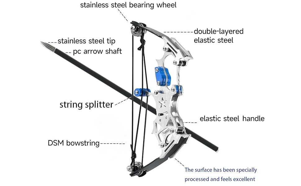 Introducing the Mini Compound Bow and Arrow Set, the perfect choice for young archery enthusiasts and professional shooters alike. This mini compound bow is crafted from high-strength stainless steel, offering exceptional performance, durability, and aesthetic appeal. As a miniature version of a modern compound bow, it boasts excellent power, stability, and accuracy, making it ideal for recreational hunting, competitions, and even challenging shooting scenarios.